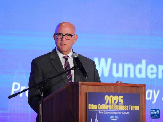 6月2日,在美国洛杉矶,旧金山湾区委员会主席吉姆·旺德曼在2025年中国—加州经贸论坛上发表讲话。新华社发(邱晨摄)