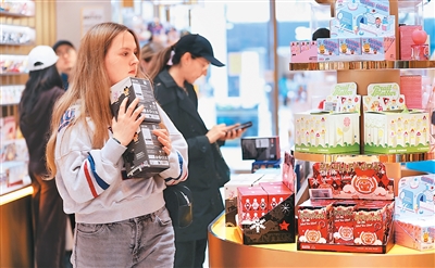 在重庆市渝中区来福士商场的泡泡玛特门店,市民选购相关产品。 孙凯芳摄(人民图片)