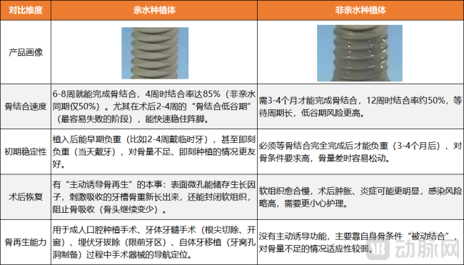 图5.亲水种植体与非亲水种植体性能对比