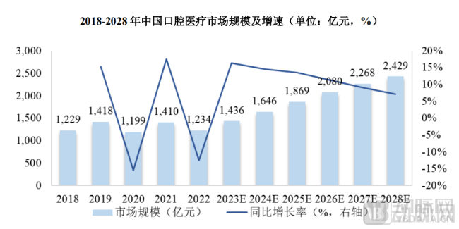 图7.2018-2028年我国口腔医疗市场规模及增速(图源:沙利文)