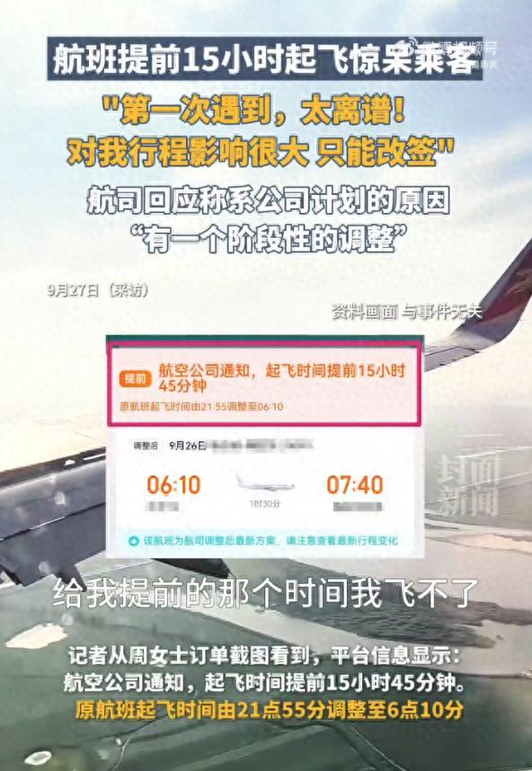 周女士最近遇到了一件让她意想不到的事情。她原本计划乘坐龙江航空的一趟航班,结果这趟航班提前了15个小时起飞。由于这个突然的变化,周女士不得不改签其他航班。
