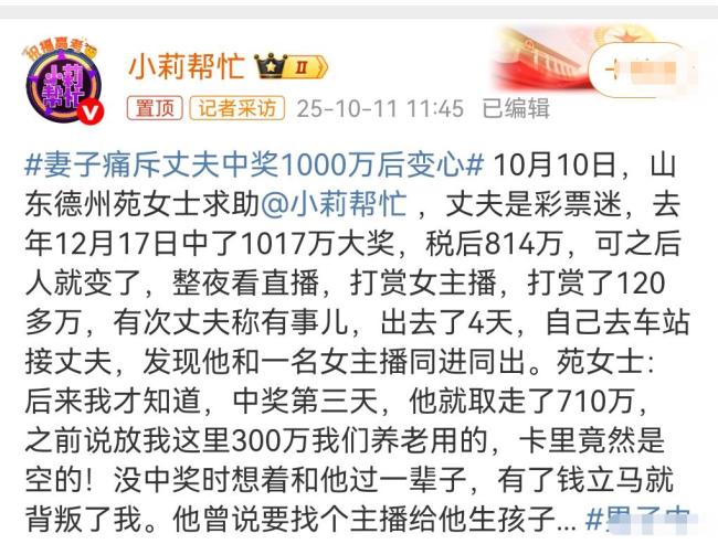 中奖1000万男子回应打赏主播 变心丈夫遭妻起诉