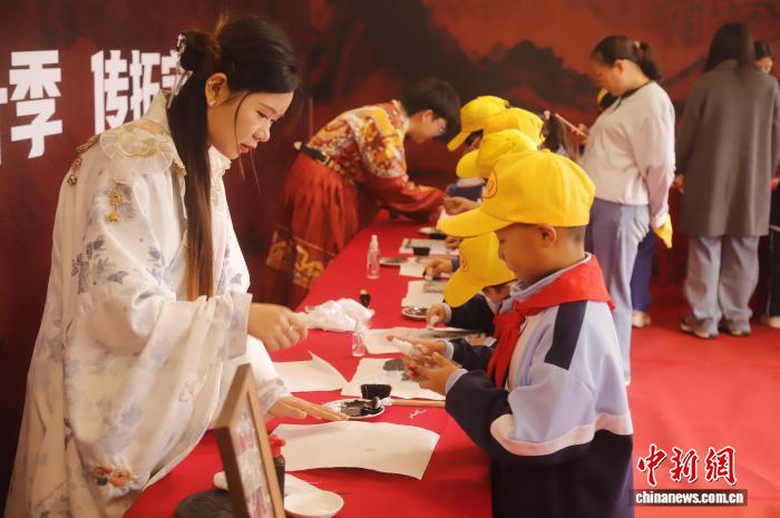 10月15日,2025年龙山红叶文化活动在山西太原龙山景区启幕,图为当日举行的非遗传拓活动。太原市文物局 提供