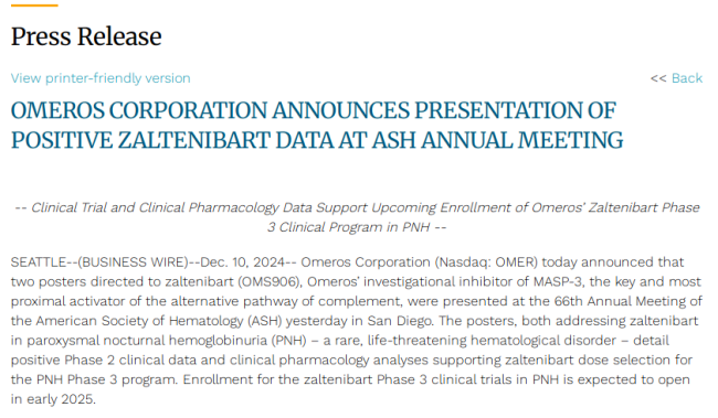 2024年12月,Omeros在美国血液年会(ASH)上公布了zaltenibart治疗PNH的Ⅱ期临床试验的积极数据。PNH是一种罕见的获得性血液疾病,患者免疫系统会错误地攻击并破坏红细胞,导致健康红细胞水平降低及其他并发症。据悉,zaltenibart已显示出优于其他在研或已上市替代途径抑制剂的多种潜在优势,且耐受性良好,迄今为止所有临床试验均显示出可接受的安全性。