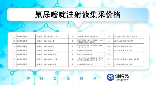 健识局梳理发现,集采前几款氟脲嘧啶注射液的价格约在30元左右。根据包头市肿瘤医院官方公众号,津药和平的氟尿嘧啶注射液原挂网价在29.4元一支,降幅高达94.25%。集采后,中选品种基本降到5元以内。