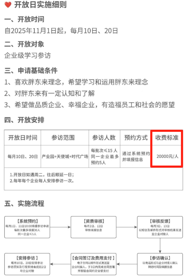 根据胖东来开放日的实施细则,开放时间自2025年11月1日起,每月10日、20日,开放对象为企业级学习参观。参访范围为“产业园+天使城+时代广场”,申请基础条件中包括希望做品质企业、幸福企业,有造福员工和社会的愿望。