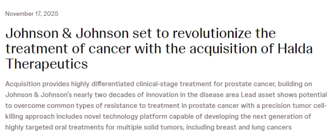 11月17日晚,强生宣布已达成最终协议,将以30.5亿美元现金收购临床阶段生物技术公司Halda Therapeutics,进一步强化肿瘤学产品线,为中长期业绩增长提供潜在动力。这笔交易预计将在未来几个月内完成,具体取决于反垄断审查及其他常规交割条件。