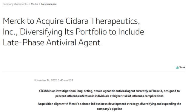 无独有偶,11月14日,默沙东也宣布将以92亿美元收购致力于开发药物-Fc偶联物(DFC)疗法的生物技术公司CidaraTherapeutics。这次收购被视为默沙东在应对“后K药时代”增长压力的重要战略举措。