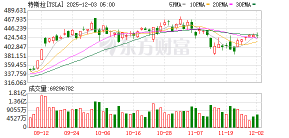特斯拉股价下跌0.21%,成交额为296亿美元。根据乘联会最新统计数据,特斯拉上海超级工厂在2025年11月份交付量超过8.67万辆,环比增长超40%,同比增长近10%。特斯拉中国官网显示,Model Y 2025年内已无可交付车辆,Model 3仅余少量现车。升级后的旗舰车型Model S/X现车也于11月上线销售,预计本月开启交付。第三季度,特斯拉电动车全球交付量创下历史新高,第四季度延续强劲增长势头:Model Y成为国内SUV销量冠军;澳大利亚市场售出第15万台特斯拉;新西兰累计交付量破2万辆,Model Y稳居当地10月最畅销的纯电动车;截至11月份,特斯拉在挪威的年内累计销量打破了此前燃油车保持的当地乘用车年度销量纪录,提前锁定2025年年度销冠。