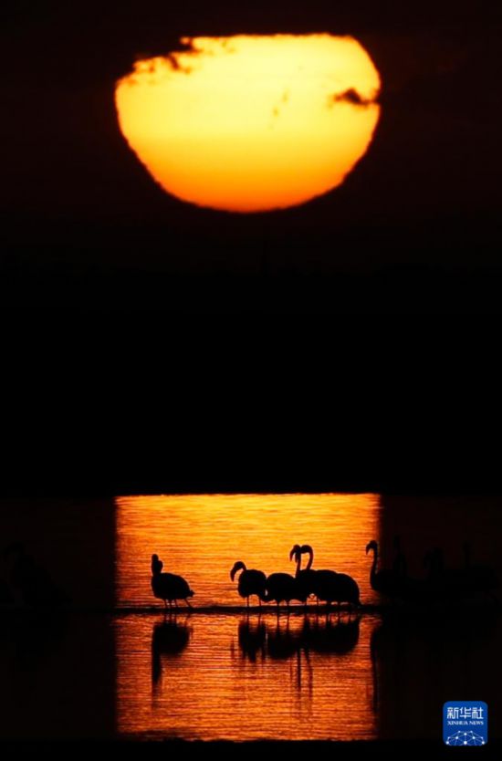 这是12月6日日出时分在埃及法尤姆省加龙湖拍摄的火烈鸟。