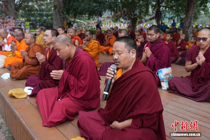 3月20日,第三届蓝毗尼国际和平节在佛祖诞生地尼泊尔蓝毗尼启幕。和平节由中国驻尼泊尔大使馆、尼泊尔奥委会、尼泊尔旅游委员会、蓝毗尼开发委员会等联合主办,包含国际禅修节、国际和平音乐会、国际和平马拉松等多项文体活动。当天清晨,近400名来自各国的僧侣、民众及游客在世界文化遗产摩耶夫人寺旁闭目冥想禅修,祈愿世界和平。图为藏传佛教僧侣吟诵经文。中新社记者 崔楠 摄