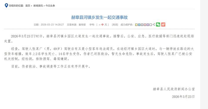 接警后,公安、应急、医疗救援等部门迅速赶赴现场处置。经查,驾驶人张某广(男,49岁)驾驶自有五菱小型客车违法超员,在途经河镇乡园区大道时,与一辆停放在路边的大型货车碰撞,致车上2名学生死亡、14名学生受伤。事故发生后,驾驶人张某广已被公安机关控制,经检测,排除酒驾、毒驾嫌疑。目前,伤者救治、事故调查等工作正在有序开展中。