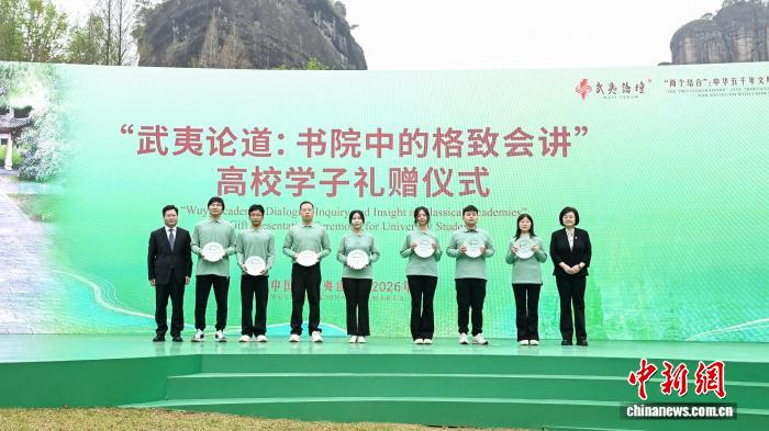 3月22日,第三届武夷论坛在福建南平武夷山开幕。图为参与论坛配套活动“武夷论道:书院中的格致会讲”高校学子礼赠仪式。(中国人民大学供图)