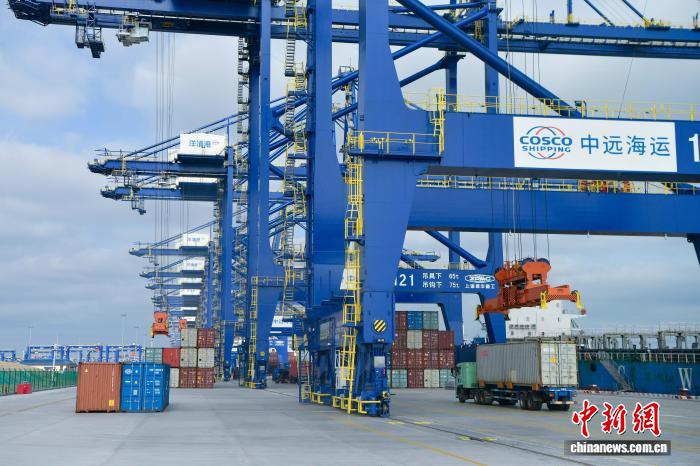 中新网儋州11月13日电 (记者 王子谦)在海南洋浦国际集装箱码头,多艘巨轮靠泊,货车穿梭往来。加拿大《天时传媒》副社长许鹏告诉中新网记者,码头上的繁忙场景,让他感受到海南航运业的蓬勃生机和自贸港的开放开发热