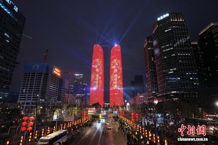 3月3日晚,四川成都,元宵节主题活动上的天府双塔主题光影秀。中新社记者 安源 摄